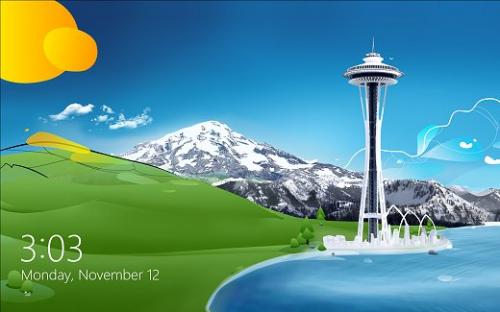 Ci-dessus, on peut voir que Windows démarre sur un écran de verrouillage. C'est la première version de bureau à en faire usage. J'ai pris cette capture d'écran sur un site Internet, puisque je n'arrive pas à faire de capture écran quand une session n'est pas encore ouverte. Désolé pour les ayants droit de cette magnifique image, s'ils trouvent que j'ai été méchant de prendre leur copie. Cet arrière-plan est celui par défaut sur toute copie vanilla de Windows 8.