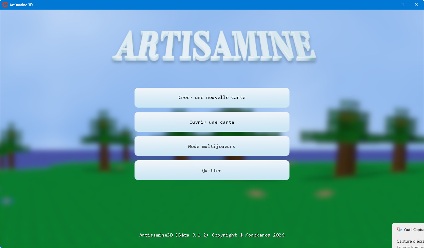 Bienvenue sur cette page Web. Artisamine 3D est un jeu codé en C# par Monokeros en janvier 2026. Il fait usage du moteur Monogame, une continuité non officielle de XNA (par Microsoft).