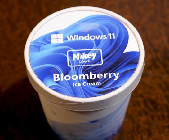 Cette image est issue d'une vidéo de MJD, sur YouTube, où ce podcasteur déballe une glace au goût myrtille, un fruit à la couleur similaire à l'identité visuelle de Windows 11. Oui, c'est authentique, il y a vraiment eu des crèmes glacées Windows 11 vendues au grand public afin de célébrer sa sortie. Elles sont de marque Mikey. Vous savez, on voit souvent des mèmes maudits sur Internet où sont représentées des glaces goût "Poisson", "Aspirine", ou encore "What's App". J'ignore si ce sont des photomontages. Mais là, c'est réel.