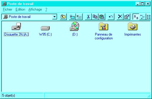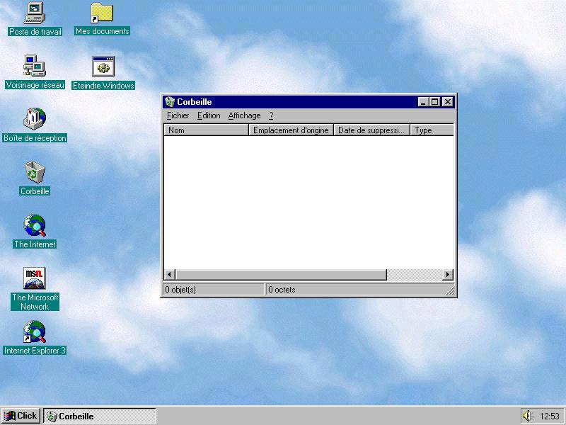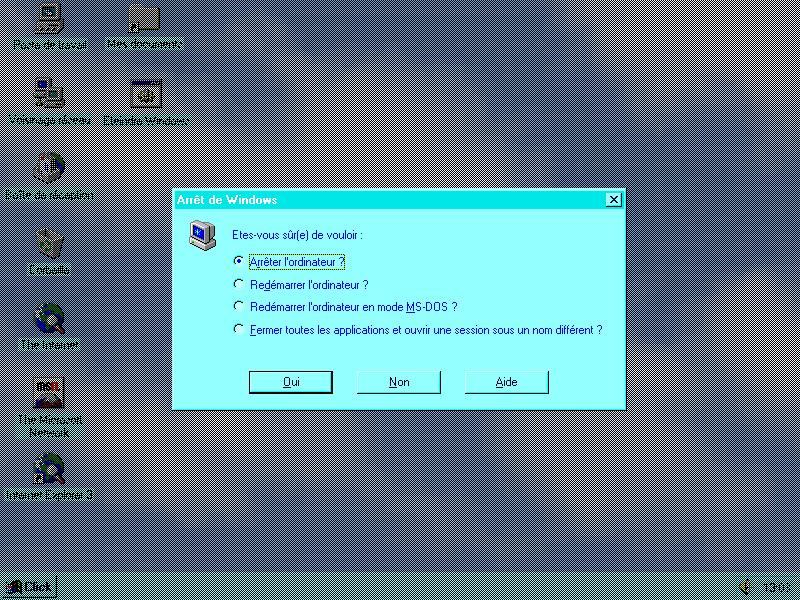 Voici l'apparence de l'interface. Les icônes sur le bureau ne sont plus les programmes en cours d'exécution, mais des fichiers de votre choix. Ils sont toujours déplaçables. Soit dit en passant que les images d'arrière-plan sont, comme Windows 3.xx, seulement au format bitmap dans la version Original Release, mais dans la version OSR2, vous pouvez mettre quasiment tout format Internet (jpg, gif, tif).