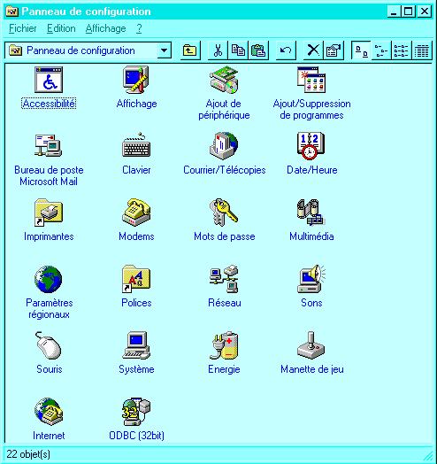 Vous pouvez voir sur le screenshot le fond d'écran par défaut. Il représente des nuages et s'appelle clouds (nuages en anglais). Le style de fenêtres est toujours personnalisable, et le panneau de configuration a été encore amélioré par rapport à Windows 3.