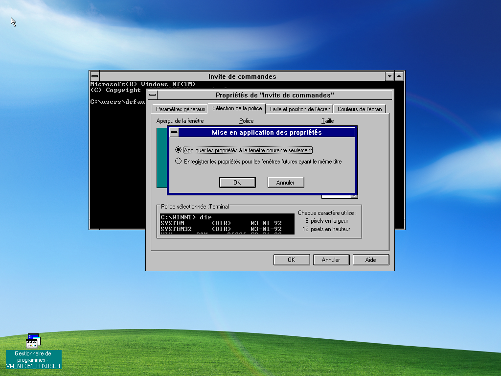 Il y avait déjà une invite de commandes, et bien sûr l'émulateur NTVDM. D'ailleurs ça fait bizarre de voir des options qui sont encore présentes sous XP ou 8, sur cette version archaïque de Windows :