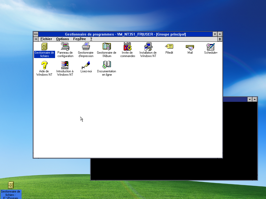 NT 3.51 un look rafraîchi qui copie celui de Windows XP. J'ai essayé d'imiter "Luna" en reprenant le jeu de couleurs dudit skin, en plus de l'arrière-plan