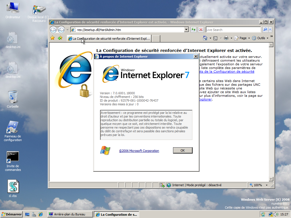Windows 2008 Server contient Internet Explorer 7, voire Internet Explorer 8.0 dans le SP1 avec un niveau de chiffrement égal à 256 bits, ce qui est aujourd'hui très avancé. (D'ailleurs vous pouvez voir sur ce screenshot la page vous donnant des informations sur cette stupide sécurité renforcée ^^)